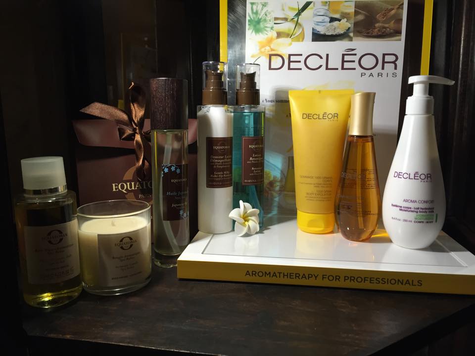 - l’accueil, une petite pièce carrée avec un comptoir où l’on craque pour la vitrine qui sent bon l’été. Joliment présentés : des produits de la gamme Equatoria fabriquée en France mais terriblement exotique (je suis fan de la fleur de frangipanier) et des produits de la marque Decléor, spécialiste de l’aromathérapie (mention spéciale pour le masque crème qui se transforme en huile et hydrate la peau sans la laisser grasse, un régal).